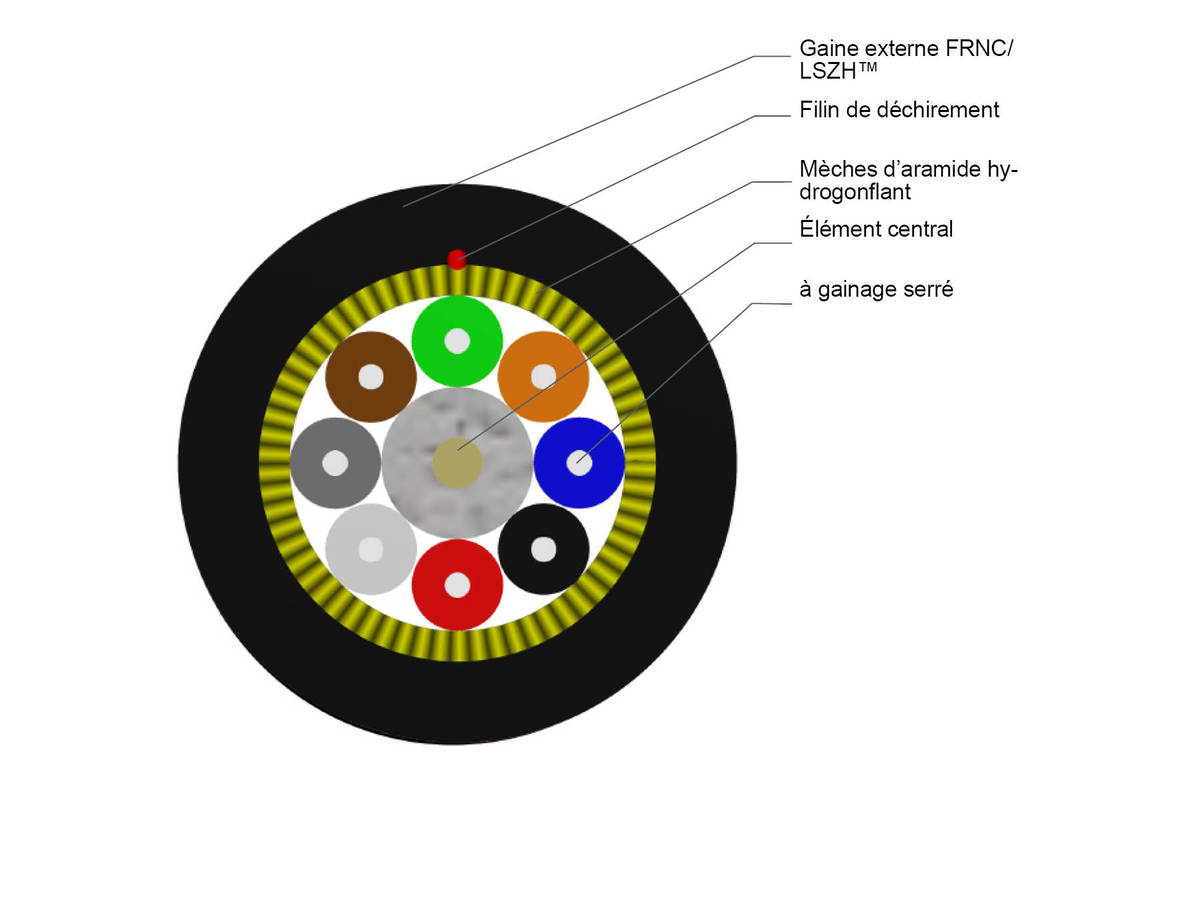 La gaine du câble et la gaine extérieure des sous-unités (non valable pour les tampons étanches de 900 µm) sont exemptes de composants nocifs pour la peinture des structures.
